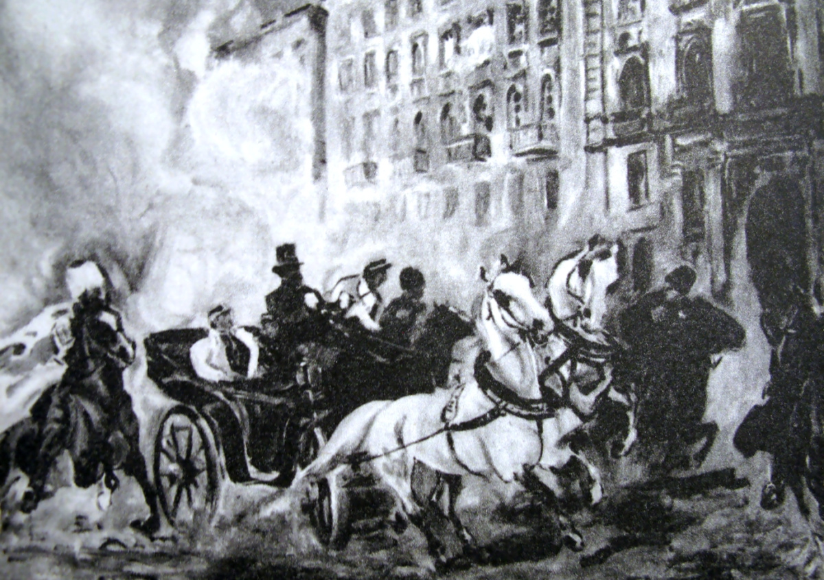 Из дворца графа Замойского, располагавшегося по левую руку напротив конвоя, начали кидать бомбы. Нападавшие стремились попасть в Берга, но мешали дым и общая неразбериха.