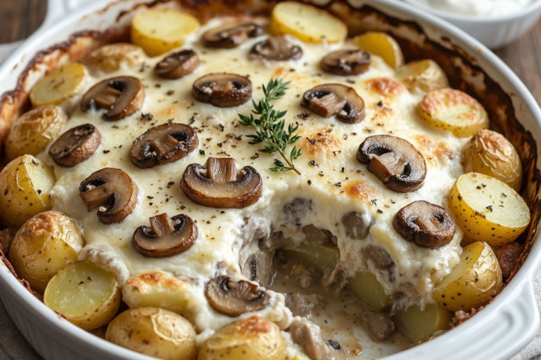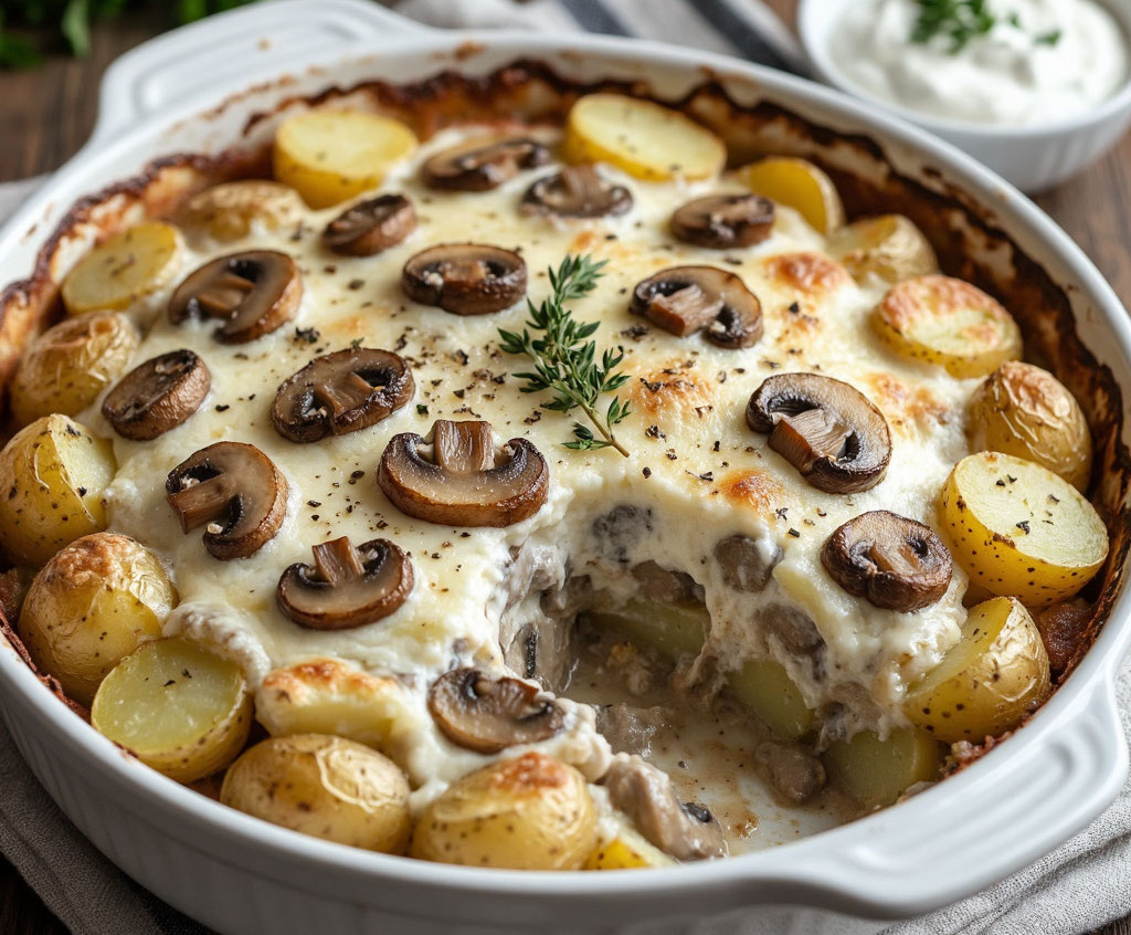 Получается обалденная вкуснятина: румяная, хрустящая сверху золотистая корочка и сочная, нежная середина, где картофель пропитан сливочно-грибным ароматом.