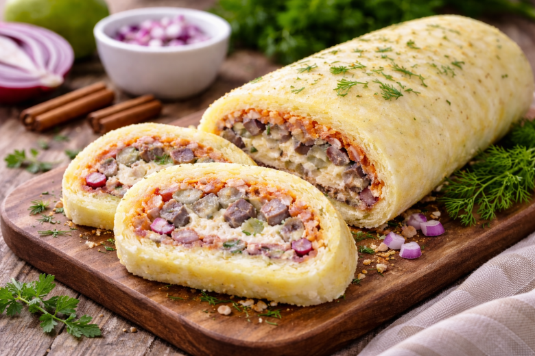 Этот рулет готовится быстро, выглядит эффектно и отлично подходит как для праздника, так и для обычного ужина. Никаких сложных ингредиентов — все простое и привычное, а результат получается аккуратным и насыщенным по вкусу. Формируется рулет на пищевой пленке, легко сворачивается и хорошо держит форму при нарезке.