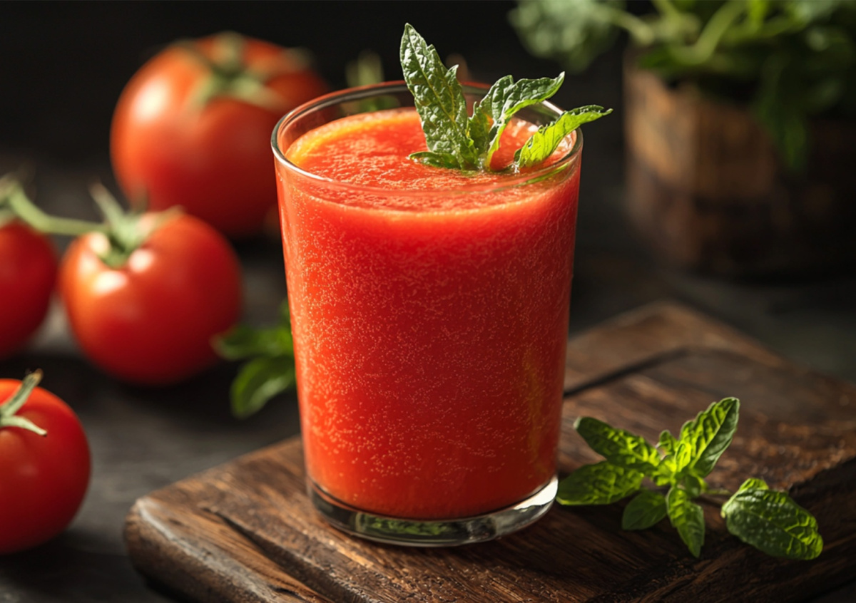 Особенность рецепта — глубокий вкусовой профиль с дымчатыми нотами и свежими травяными акцентами. Такой томатный сок с базиликом подают охлажденным со льдом, в составе коктейлей или как пикантный аперитив. Хранят в стерильной таре до 5 суток.