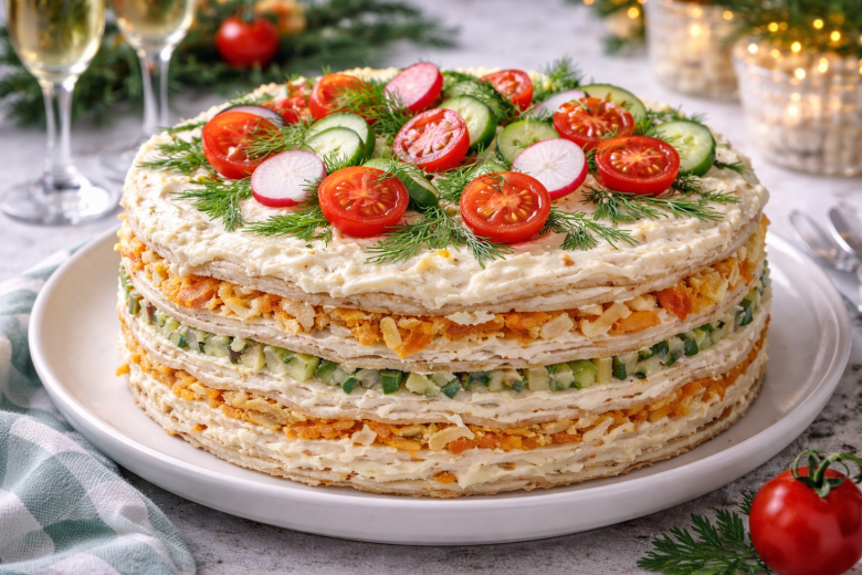 Когда гости идут один за другим, этот закусочный торт из лаваша становится настоящей палочкой-выручалочкой. Собирается быстро, выглядит эффектно, а на вкус — сытный, сочный и очень «праздничный». Отличный вариант без духовки и лишней суеты.