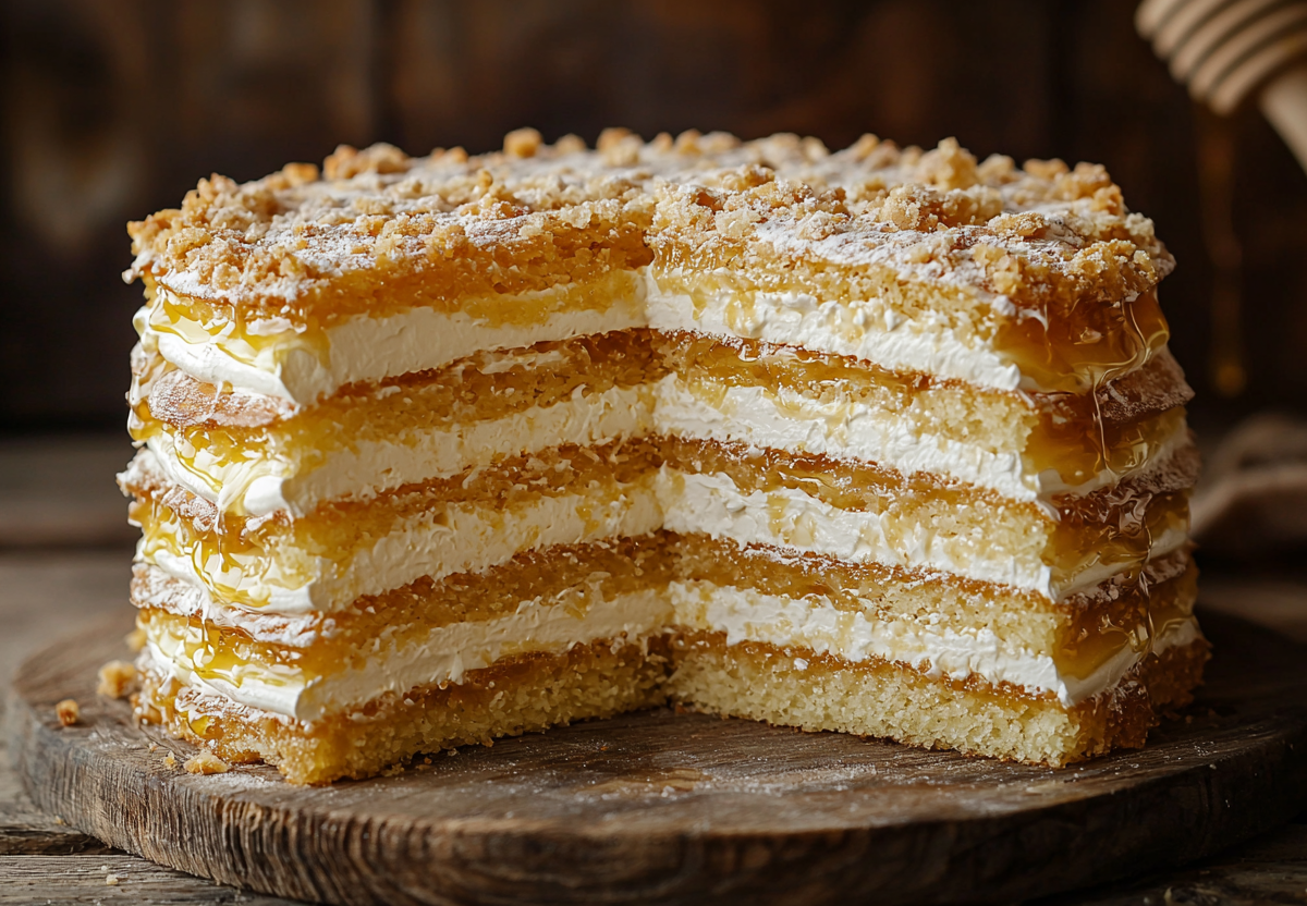 Рецепт: для теста растопите в сотейнике 100 г сливочного масла со стаканом сахара и 3 ст. л. меда. Снимите с огня, вбейте 2 яйца, всыпьте 1 ч. л. соды, быстро перемешайте до вспенивания. Всыпьте 3 стакана просеянной муки и замесите жидкое, липкое тесто. Разделите его на 6–8 частей (можно визуально). Каждую часть выливайте на середину противня, застеленного пергаментом, и сразу размазывайте ложкой в тонкий круг. Выпекайте коржи в разогретой до 180 °C духовке 5–7 минут каждый до румяного края. Горячие коржи сразу обрежьте по тарелке. Для крема взбейте 800 г жирной сметаны с 1,5 стакана сахарной пудры. Обрезки коржей измельчите в крошку. Собирайте торт, щедро промазывая коржи кремом, а бока и верх обильно обсыпая медовой крошкой. Дайте торту настояться в холодильнике.