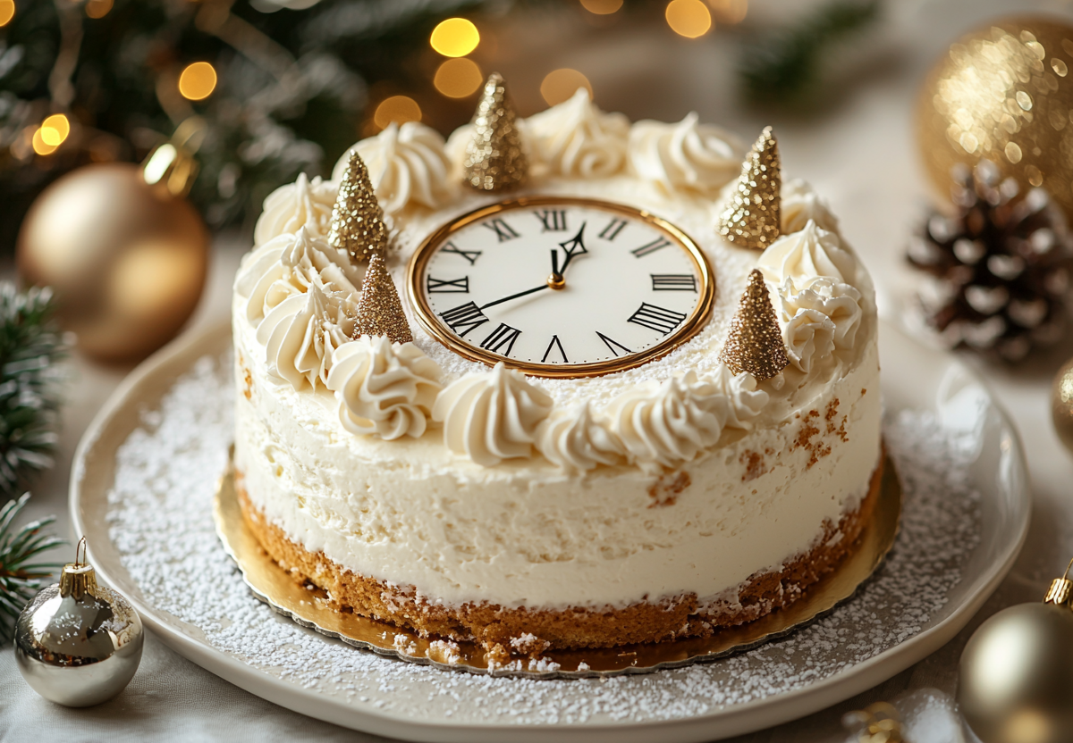 Для бисквита взбейте 4 яйца со стаканом сахара до пышной светлой массы. Аккуратно введите стакан просеянной муки с чайной ложкой разрыхлителя. Выпекайте в смазанной форме при 180 °C 30–40 минут. Полностью остудите. Для крема взбейте 500 мл холодных сливок (33%) со стаканом сахарной пудры и ванильным экстрактом до устойчивых пиков. Разрежьте бисквит на коржи и промажьте кремом. Верх торта покройте белым или серебристым кремом. Из марципана или мастики создайте циферблат и стрелки, установив их на положение 12:00. Также можно взять шоколадные монетки, нанести на них цифры и расположить кругом на торте как циферблат. Украсьте кондитерскими блестками — и ваш волшебный торт готов!