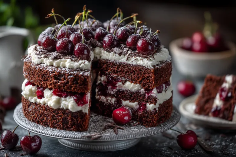 Вишню промойте, удалите косточки и замаринуйте в роме на час. Выпеките два бисквита, остудите и разрежьте каждый на два коржа. Крем готовим из масла, сахарной пудры и сливочного сыра, добавляя вишневый сироп. Соберите торт: каждый корж пропитайте ромом с соком, распределите крем и ягоды. Верхний слой покройте кремом и украсьте вишней. Десерт готов — нежный, ароматный и эффектный на столе.