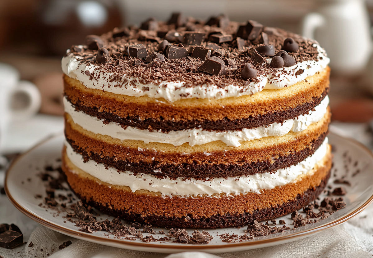 Смажьте коржи кремом, сложите стопкой. Для эффекта «трухлявости» поломайте один корж крошкой, посыпьте бока. После ночи в холодильнике торт становится влажным, как бисквитный пудинг. Украсьте тертым шоколадом, орехами или ягодами.