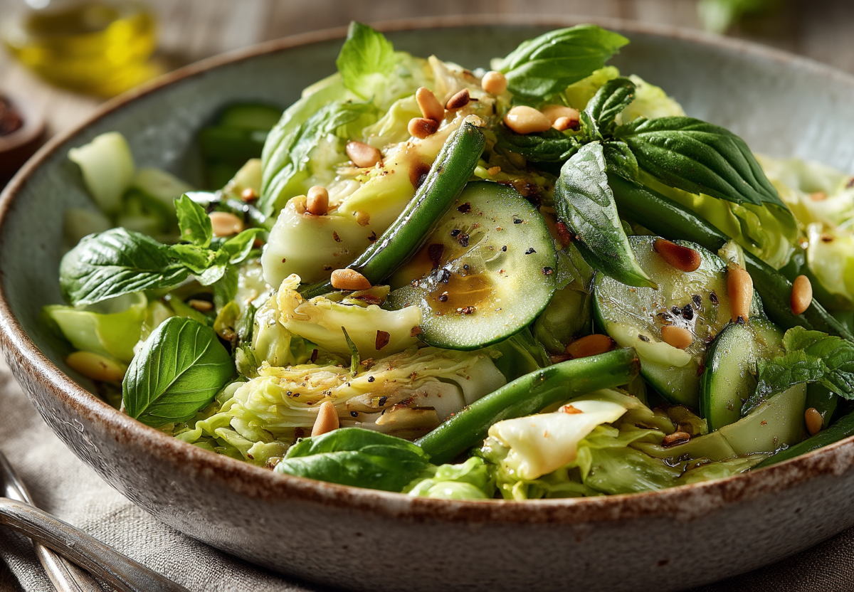 Капуста белокочанная (300 г), стручковая фасоль (замороженная, 200 г), огурец свежий (1 шт., крупный), салат листовой (пучок, 50 г), базилик свежий (пучок, 15 г), орехи кедровые (3 ст. л.), масло оливковое (2 ст. л. + для тушения), соль, перец черный молотый.