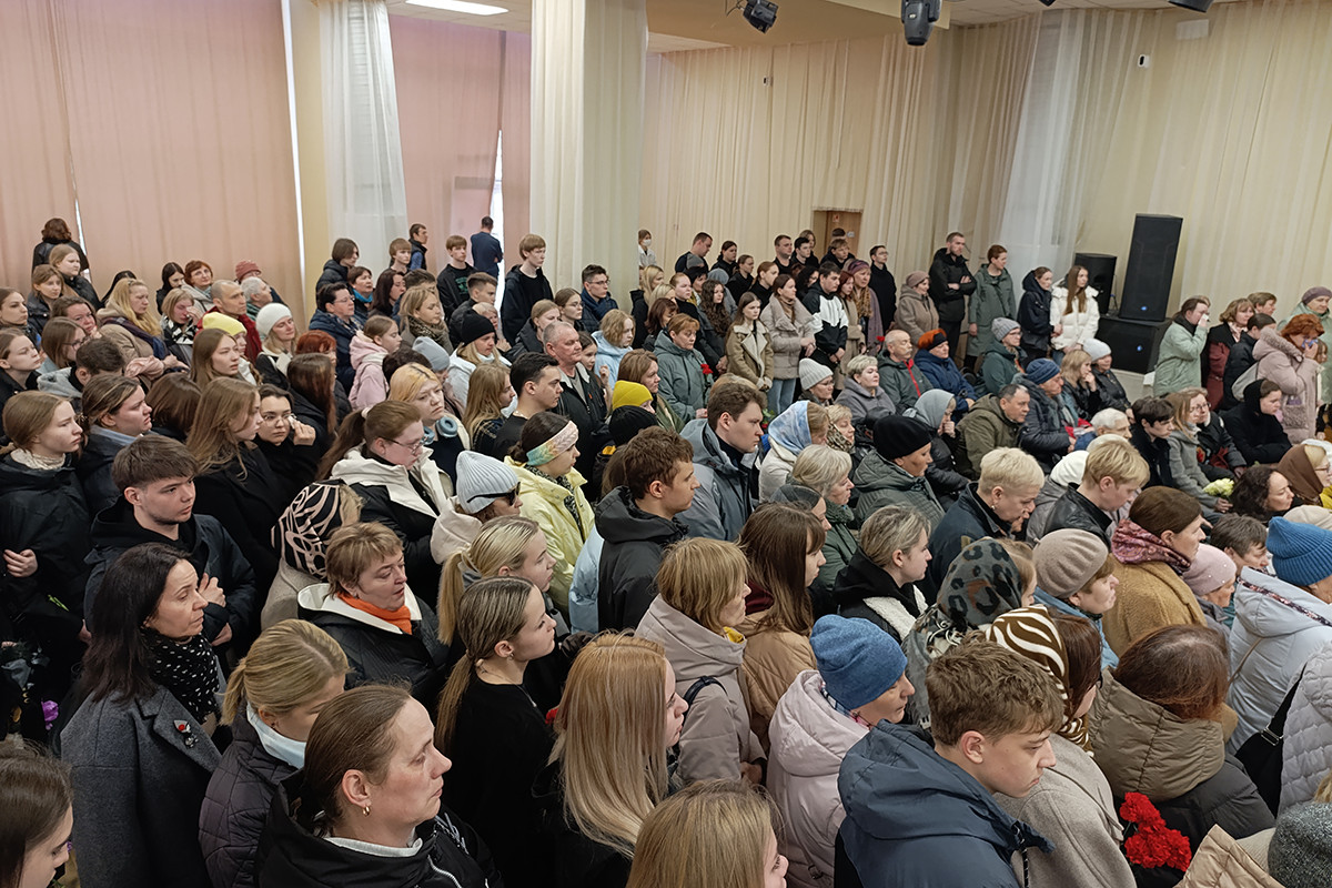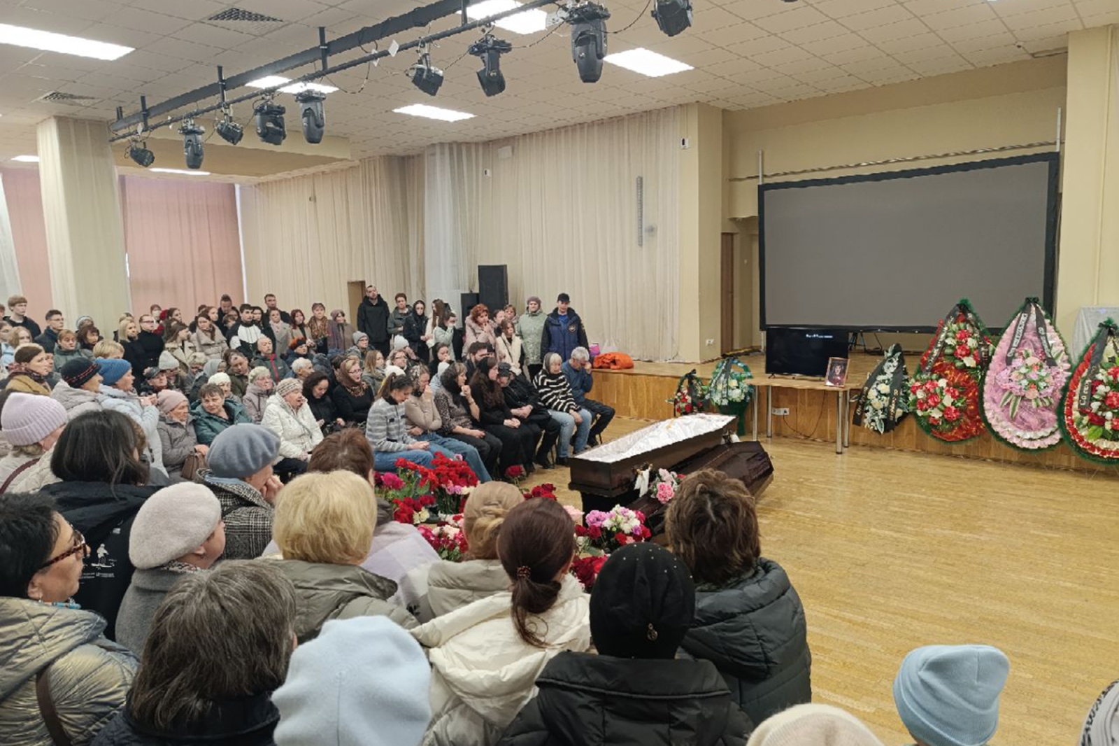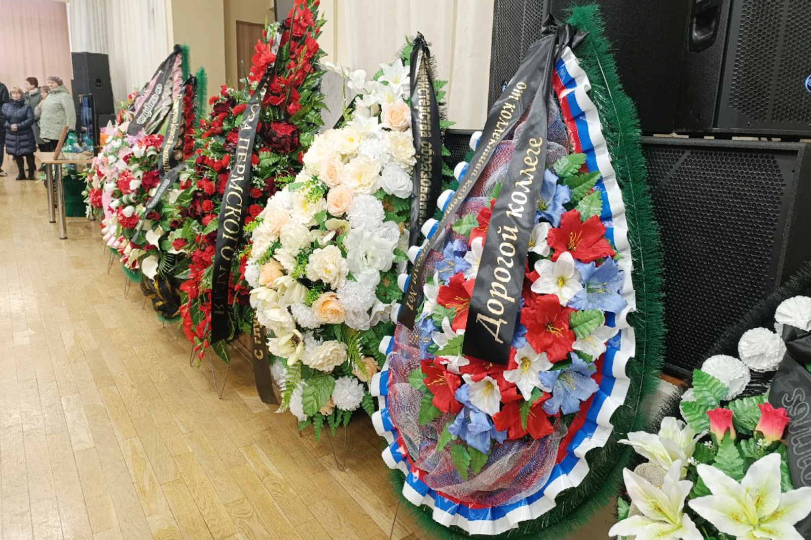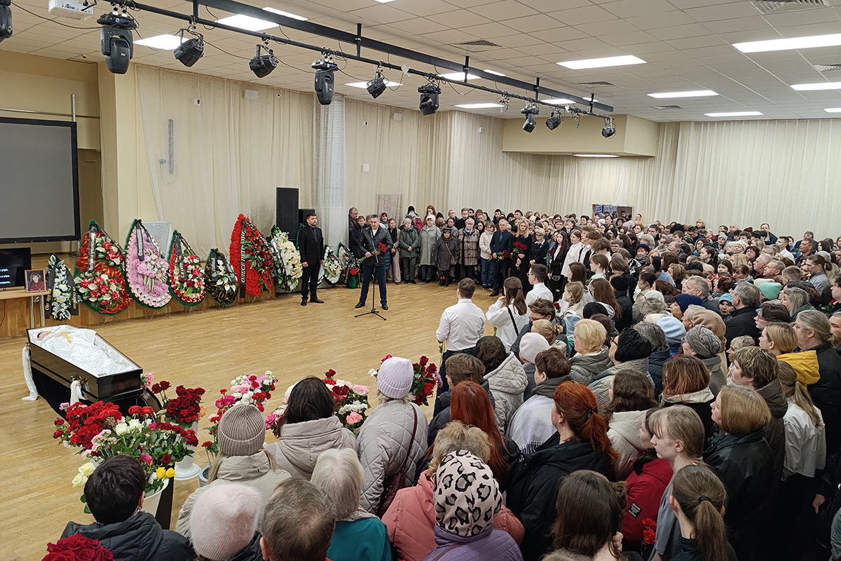 Церемония прощания с учительницей школы № 5 Олесей Багутой, погибшей утром 7 апреля от рук девятиклассника, проходит в городе Добрянке Пермского края. Около 200 человек пришли проститься с педагогом во Дворец культуры и спорта имени В. А. Ладугина.