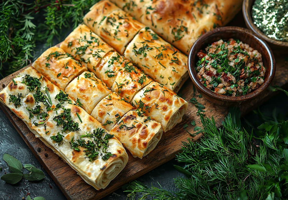 Первая закуска: хрустящие рулетики с сыром и зеленью.