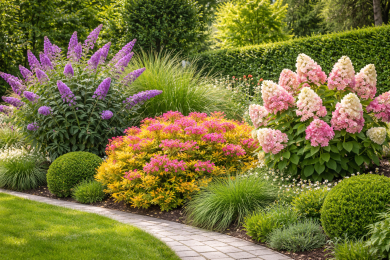 Если посадить эти три многолетника вместе, получится настоящий «живой фонтан» — разная высота, фактура и цвет создают объём и делают сад визуально более ухоженным и стильным. Если хочется добавить саду объёма и цвета, начните с буддлеи Давида «Райский сад». Её не зря называют «осенней сиренью» — длинные ароматные соцветия распускаются с июня и держатся до осени. Куст быстро растёт, достигает до 2–3 метров и буквально усыпан лиловыми «свечами» с медовым ароматом. На одной ветке можно увидеть и бутоны, и цветы одновременно. Предпочитает солнечные места и питательную почву.