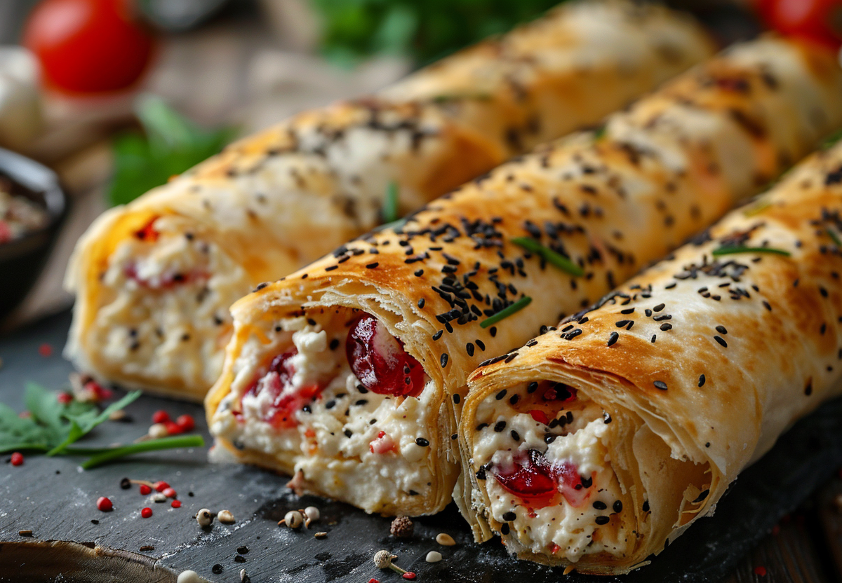 Готовлю начинки параллельно. Для творожной: творог смешиваю со сметаной, сахаром и ванилью до однородности. Для вишневой: вишню (свежую или размороженную) смешиваю с крахмалом, разведенным в холодной воде. Для маковой: мак заливаю молоком, довожу до кипения и томлю на медленном огне 15 минут, затем добавляю мед. Лаваш расстилаю на пергаменте. По всей длине лаваша выкладываю три полосы начинок: творожную, вишневую и остывшую маковую. Аккуратно сворачиваю лаваш плотным рулетом, перекладываю на противень швом вниз. Смазываю взбитым желтком, посыпаю кунжутом. Выпекаю в разогретой до 180°C духовке 20–25 минут до золотистой корочки. Даю немного остыть перед нарезкой.