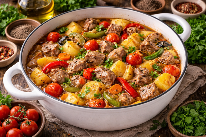 Это блюдо выручает, когда хочется домашней еды без долгой готовки и гор грязной посуды. Нежная свинина, пропитанная ароматами специй, сочный картофель и яркие овощи томятся вместе и создают насыщенный, по-настоящему уютный вкус. Такой ужин легко станет любимым в будние дни.
