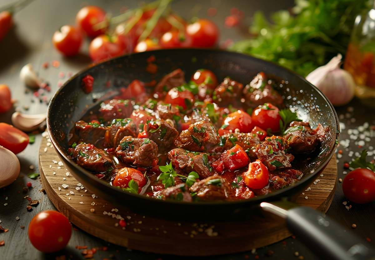 Говядина с томатами — это сытное, сочное и простое в приготовлении мясное блюдо. Делимся простым рецептом нежной говядины, тушенной в сковороде.