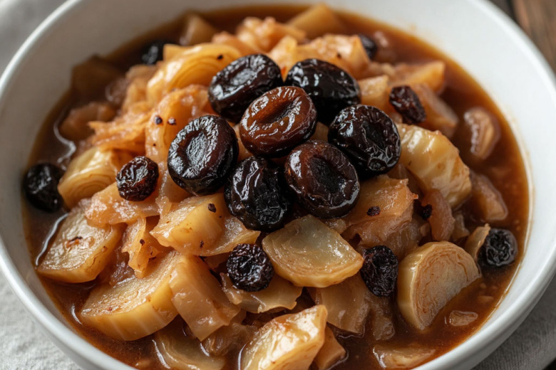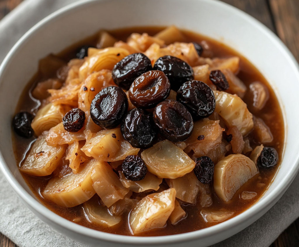 Для приготовления вам понадобится: 500 г белокочанной капусты, 100 г чернослива без косточек, 1 луковица, 1 морковь, 2 ст. л. томатной пасты, 1 ч. л. тмина, 1/2 ч. л. кориандра, лавровый лист, соль, перец, растительное масло, немного воды. Капусту нашинкуйте, лук и морковь нарежьте. В глубокой сковороде обжарьте лук с морковью, добавьте капусту, тушите 10 минут. Чернослив замочите в горячей воде на 10 минут, затем нарежьте полосками. Добавьте к капусте чернослив, томатную пасту, специи, соль, перец и немного воды. Тушите под крышкой на медленном огне 30–40 минут. Подавайте горячей или на следующий день разогретой — будет еще вкуснее.