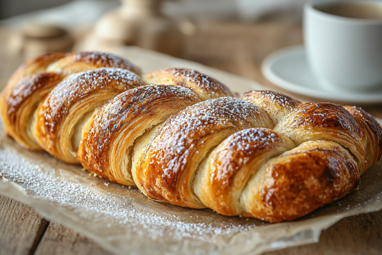 2. Свернуть пласт вдоль в плотный рулет, разрезать вдоль на две части и свернуть их между собой косичкой. Выпекать в разогретой до 180°C духовке 30 минут до золотистого цвета. Дать немного остыть перед подачей.