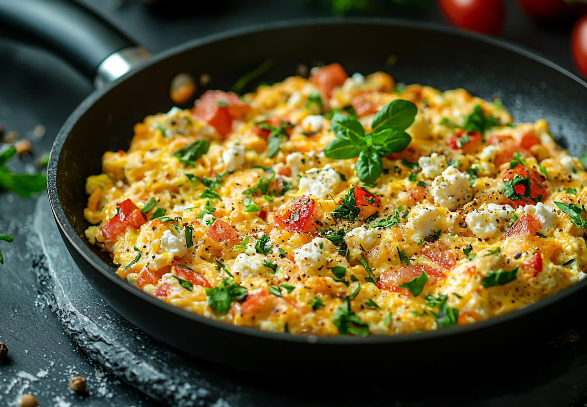 Готовлю я так: разогреваю сковороду с небольшим количеством сливочного масла. Выкладываю 100–150 граммов творога 5% и обжариваю 2–3 минуты до легкой румяности. Два яйца взбиваю вилкой с щепоткой соли и любимыми специями — отлично подходит паприка или куркума. Заливаю творог яичной смесью, добавляю нарезанные овощи по желанию и готовлю на среднем огне до схватывания яиц. В конце посыпаю 20 граммами тертого сыра и свежей зеленью. Подаю с порцией медленных углеводов — рисом, гречкой или цельнозерновым тостом.