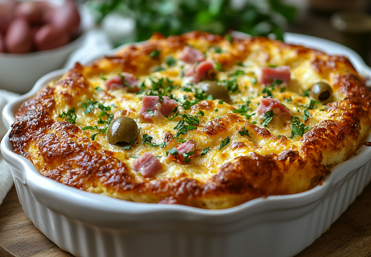 Добавляю 50 г нарезанной кубиками ветчины из индейки, нарезанный маринованный огурчик и 4 разрезанные пополам маслины. Аккуратно перемешиваю. Массу выливаю в жаропрочную форму, сверху посыпаю 60 г тертого сыра. Выпекаю в разогретой до 180°C духовке 30 минут до золотистой сырной корочки. Подаю слегка остывшим.