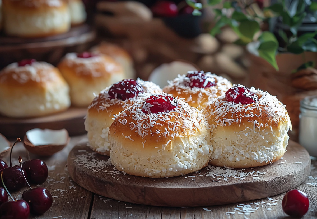 Творожные булочки «Смешарики» с черешней и кокосовой стружкой! Вкусный и полезный завтрак. При выпечке они раздуваются и становятся кругленькими, и дети назвали их смешариками. Эти нежные булочки с сочной начинкой подойдут даже тем, кто следит за фигурой. Ароматные, лёгкие и очень вкусные — попробуйте!