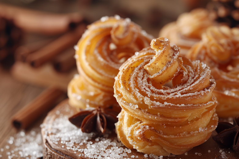 Выложите кружки внахлест в линию (по 5-6 штук), сверните в плотный рулетик. Разрежьте пополам — получится две розочки. Выложите в смазанную маслом форму, выпекайте при 180 °C 20 минут до легкого румянца. Горячие розочки обильно посыпьте сахарной пудрой — она растает, создавая сладкую глазурь.