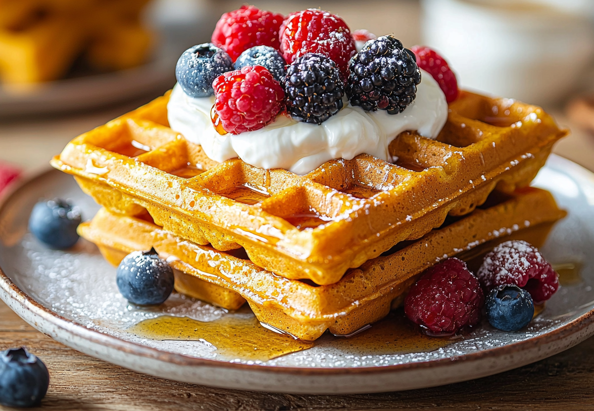 - Для выпекания в духовке: разогрейте духовку до 180 °C, форму для вафель смажьте маслом, вылейте тесто и выпекайте 15–20 минут до сухой зубочистки. Подавайте вафли теплыми с греческим йогуртом, свежими ягодами или легким медовым сиропом.