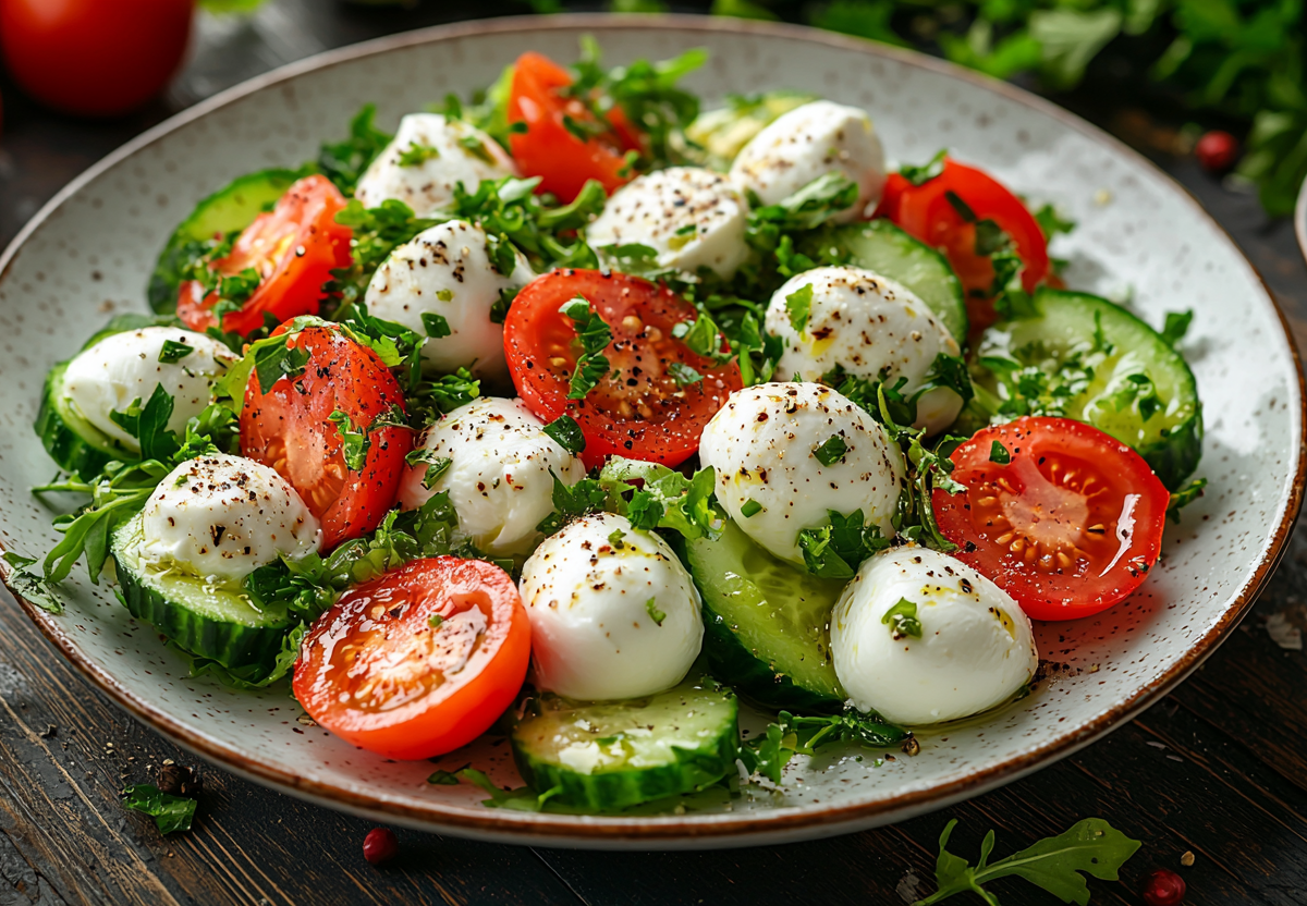 Для приготовления понадобятся: мини-моцарелла (100 г), огурец (1 шт.), помидоры (2 шт.), зелень (петрушка, рукола), греческий йогурт (2 ст. л.), соль и перец по вкусу.