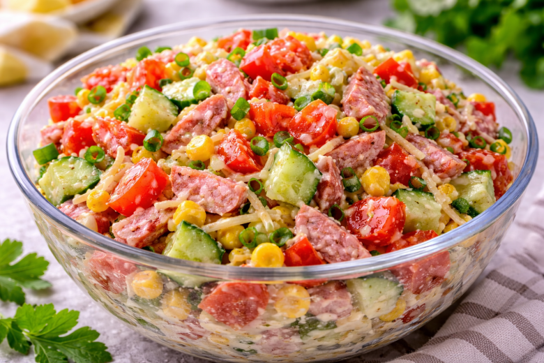 Копченая колбаса — 200 г, сыр — 200 г, болгарский перец — 2 шт., помидоры — 3 шт., огурец свежий — 1 шт., зеленый лук — 1 пучок, кукуруза консервированная — 1 банка, майонез — по вкусу, соль — по вкусу, перец — по вкусу.