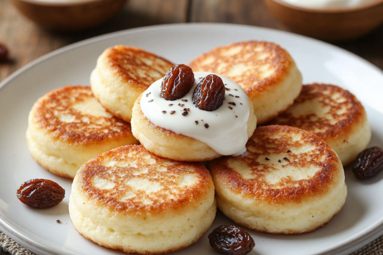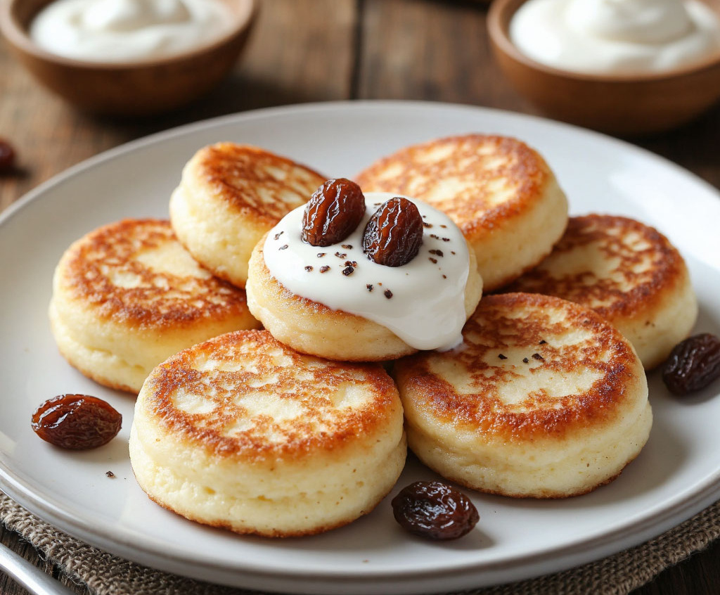Для приготовления вам понадобится: 500 г творога (желательно сухого, рассыпчатого), 2 яйца, 4 ст. л. муки, 3 ст. л. сахара, 50 г изюма, 1 ч. л. ванильного сахара, щепотка соли, растительное масло для жарки, сметана для подачи. Изюм предварительно залейте кипятком на 10 минут, затем обсушите. Творог протрите через сито или хорошо разомните вилкой. Добавьте яйца, сахар, ванильный сахар, соль и муку. Тщательно перемешайте до однородности, в конце вмешайте изюм. Сформируйте из творожной массы небольшие круглые сырники, обваляйте их в небольшом количестве муки для лучшей корочки. Разогрейте масло на сковороде на среднем огне. Обжаривайте сырники по 3–4 минуты с каждой стороны до образования румяной хрустящей корочки. Подавайте горячими, обязательно со сметаной.
