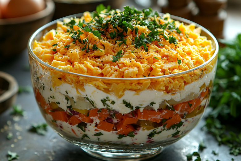 Для нашего салата возьмем 2–3 картофелинки и пару морковок — отварим их заранее. Лук и соленые огурчики нарежем мелко, шпроты разомнем вилкой. Яйца разделим на белки и желтки — они пойдут отдельными слоями. Сыр (100 г) натрем на терке, а свежей зелени добавим для красоты.