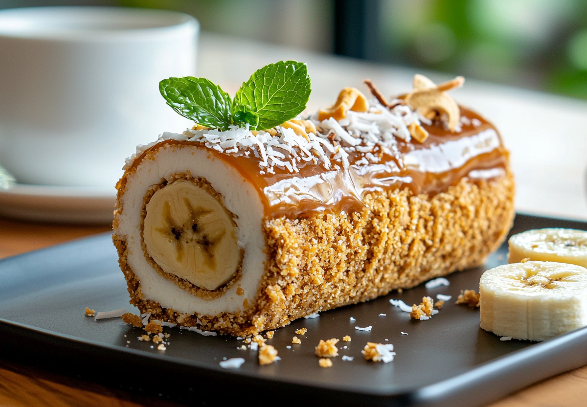 2. На фольгу выложите смесь, сформировав прямоугольник. В центр поместите банан. Аккуратно заверните края, придавая форму рулета. Уберите в холодильник на два часа. Перед подачей посыпьте кокосовой стружкой и нарежьте на три продолговатых пирожных. Готово!