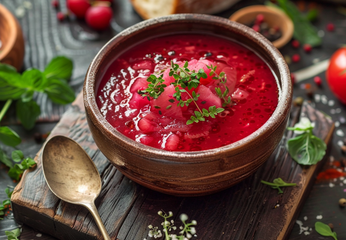 После чего суп солят, закладывают в него оставшуюся сырую свеклу, добавляют лавровый лист и держат на малом огне 5 минут. После этого огонь следует выключить, а кастрюлю оставить на горячей конфорке на четверть часа, чтобы борщ дошел. Подают такой борщ с нежирной сметаной, а в пост — со свежей зеленью.