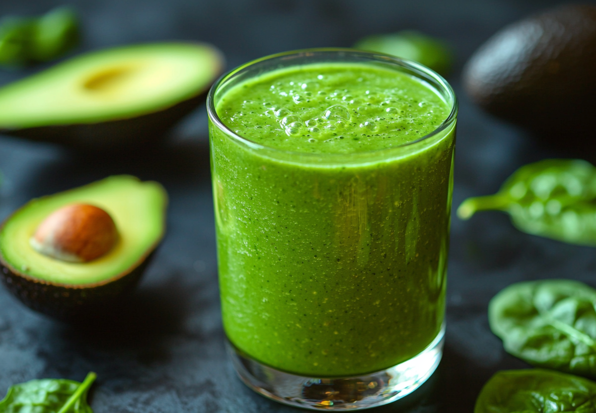 1 спелый банан, половинку авокадо, горсть шпината и 10 г имбиря помещают в блендер. Добавляют 200 мл миндального молока, 1 ст. л. семян чиа и 1 ч. л. спирулины. Взбивают до однородной консистенции. Для сладости можно добавить 1 ч. л. меда или фиников. Пьют свежеприготовленным, лучше в первой половине дня или во время повышенных нагрузок.