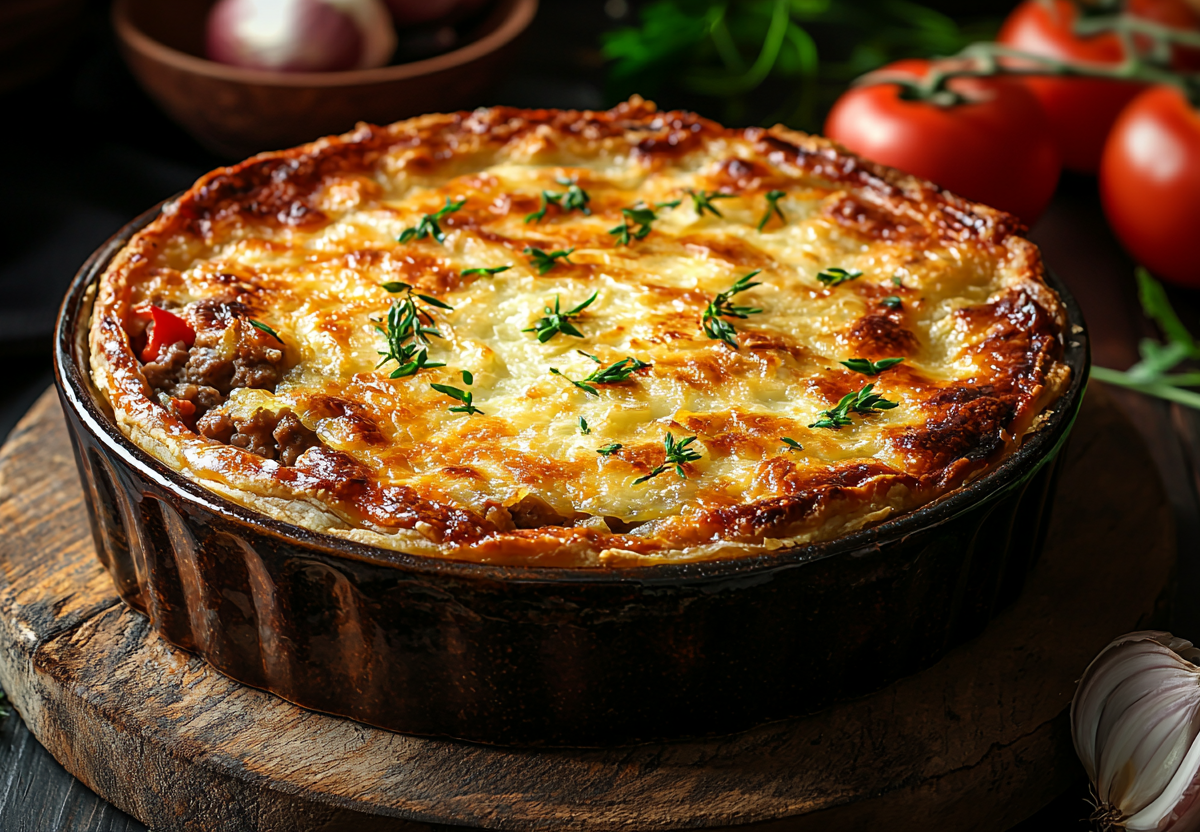 Вам понадобится: 1 кг картофеля (очистить и нарезать тонкими слайсами), 500 г мясного фарша, 2–3 помидора (тонкими кружками), 2 луковицы (мелко нарезать), 150–200 г майонеза, соль, перец, специи по вкусу. В глубокой форме для запекания, смазанной маслом, выложите первый слой картофеля, посолите, поперчите и смажьте майонезом. На него равномерно распределите часть фарша, смешанного с луком, солью и перцем. Следующий слой — кружки помидоров. Повторите слои 2–3 раза, заканчивая картофелем, смазанным майонезом. Накройте форму фольгой и запекайте в разогретой до 180 °C духовке 50 минут. Затем снимите фольгу и запекайте еще 15–20 минут до румяной корочки.