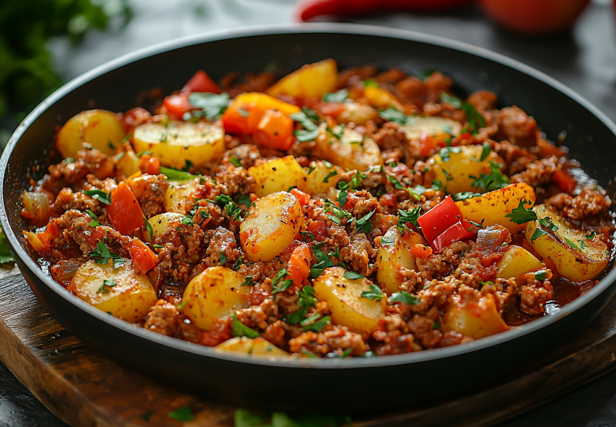 Вам понадобится: 400 г мясного фарша, 6–8 картофелин, 1 луковица, 1 морковь, 1 болгарский перец, 1–2 помидора (или 2 ст. л. томатной пасты), растительное масло, соль, перец, паприка, другие любимые специи. Нарежьте лук и морковь, обжарьте на разогретом масле в глубокой сковороде до мягкости. Добавьте фарш, разбивая комочки, и жарьте до изменения цвета. Введите нарезанные кубиками помидоры и болгарский перец, тушите 5–7 минут. Посолите, поперчите, добавьте специи. Картофель очистите и нарежьте крупными дольками. Выложите картофель к фаршу с овощами, аккуратно перемешайте. Влейте 100–150 мл горячей воды или бульона, чтобы картофель был наполовину покрыт. Накройте крышкой и тушите на среднем огне 20–25 минут, пока картофель не станет мягким.