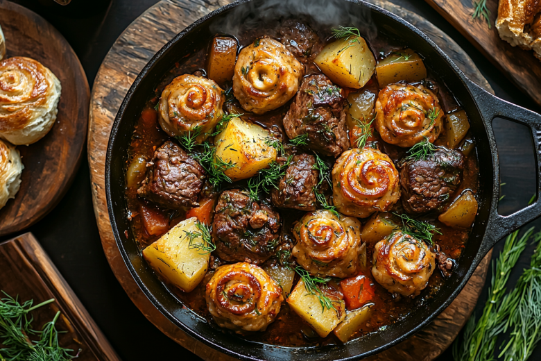 Достаю кастрюлю из духовки, снимаю крышку и фольгу. Аккуратно выкладываю штрудли срезом вверх на поверхность рагу. Накрываю крышкой без фольги и возвращаю в духовку еще на 25–30 минут, пока тесто не пропечется. Подаю сразу, прямо в кастрюле.