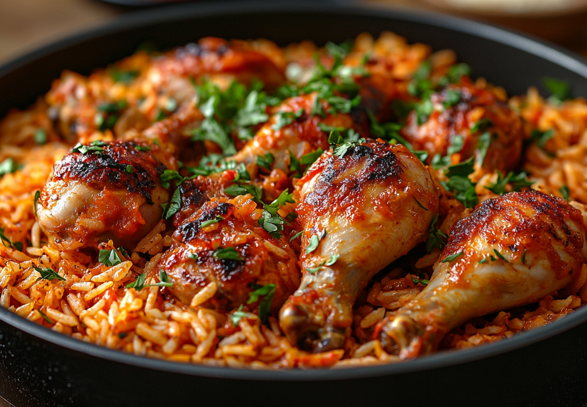 Обжарьте 8 куриных голеней до золотистости на оливковом масле (5 минут на 1 сторону), выложите на тарелку. В ту же сковородку киньте 1 нарезанный лук, 1 тертую морковь, 2 зубчика чеснока — пассеруйте 5 минут. Верните голени, добавьте 250 г промытого риса, залейте 500 мл бульона (или воды) так, чтобы жидкость покрывала рис на 1 см. Приправьте 1 ч. л. паприки, 2 лавровыми листами, солью, перцем. Для соуса 2 ст. л. томатной пасты смешайте с 1 ст. л. сметаны и 100 мл воды, вылейте в сковороду. Тушите под крышкой 20 минут на малом огне. За 5 минут до готовности по желанию добавьте 100 г замороженного горошка.