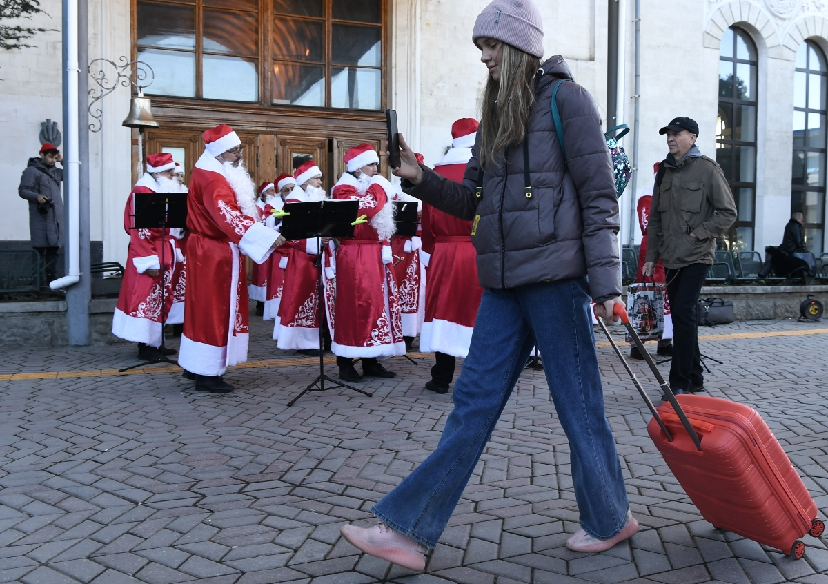 Оркестр Дедов Морозов встречает гостей Крыма на железнодорожном вокзале в Симферополе Оркестр Дедов Морозов встречает гостей Крыма на железнодорожном вокзале в Симферополе Фото: Константин Михальчевский / РИА Новости