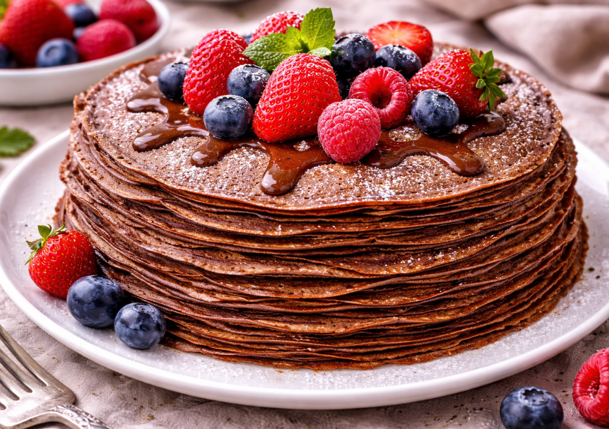 Ингредиенты (15–18 блинов): яйца — 4 шт., сахар — 4–5 ст. л., кефир — 480 мл, кипяток — 480 мл, пшеничная мука — 320 г, какао-порошок — 3 ст. л., сода — 1 ч. л., соль — щепотка, растительное масло — 4 ст. л., ванильный сахар — 1 ч. л. (по желанию).