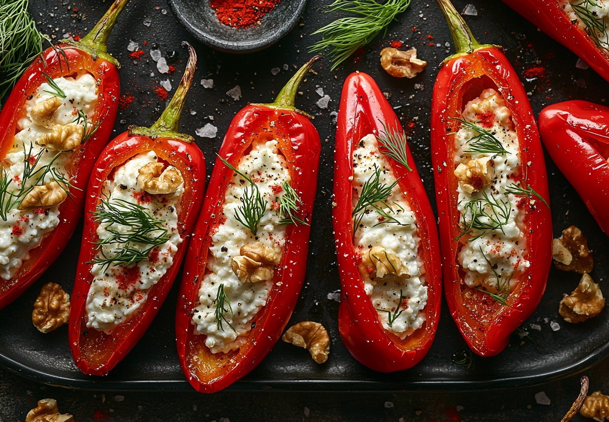 Перцы вымойте, разрежьте вдоль на половинки и удалите семена. Разложите их на противне, слегка смажьте оливковым маслом и запекайте при 190 °C около 10–12 минут до мягкости, но с сохранением формы и легкого хруста. Пока перцы остывают, приготовьте начинку — смешайте творожный сыр, мелко нарубленный укроп, измельченные орехи и чеснок, добавьте соль и перец, доведите смесь до нежной, густой консистенции. Наполните остывшие половинки перцев ароматной сырной массой с горкой. Для маринада соедините оливковое масло, яблочный уксус, щепотку соли, черного перца и паприки, взболтайте до эмульсии и равномерно полейте готовые фаршированные перцы, дайте настояться, чтобы вкус стал более глубоким и насыщенным.