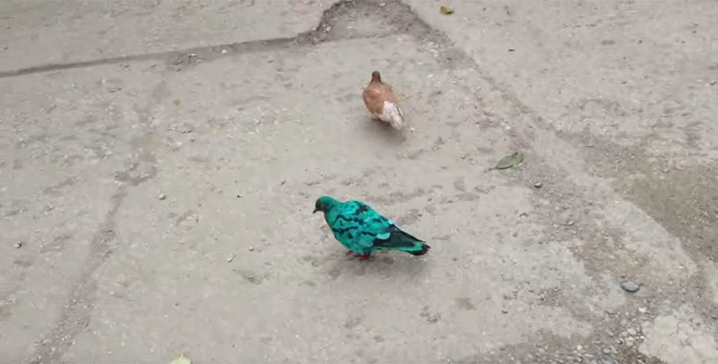 Жители сразу нескольких районов северо-востока Москвы во время прогулки стали свидетелями появления перед ними голубя странного зелёного цвета — птица спокойно прогуливалась перед горожанами и совершенно не боялась их.