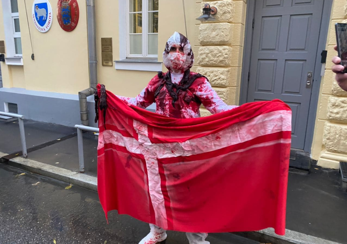 В пятницу к дверям посольства пришёл акционист, державший в руках датский влаг. И полотнище, и сам мужчина были облиты красной жидкостью, имитирующей кровь. Таким образом он выразил протест против уничтожения животных.