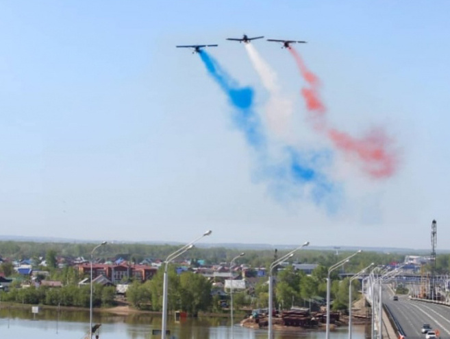 Авиационная группа в Уфе во время воздушной части парада изобразила флаг французского государства. Фотографии появились в Instagram главы Башкирии Радия Хабирова.