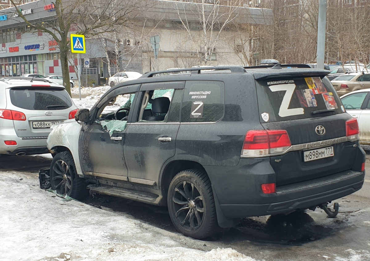 Ранее 18-летний житель Москвы поджег автомобиль Toyota Land Cruiser, обклеенный Z-символикой. По словам хозяина авто, ранее поджигатель был судим, а буква Z, прилепленная на стекла и кузов иномарки, буквально «мешала жить» молодому человеку. Его задержали. На видеозаписи видны последствия поджога: разбитая «морда» машины, а также лопнувшие стекла. В результате инцидента никто не пострадал.