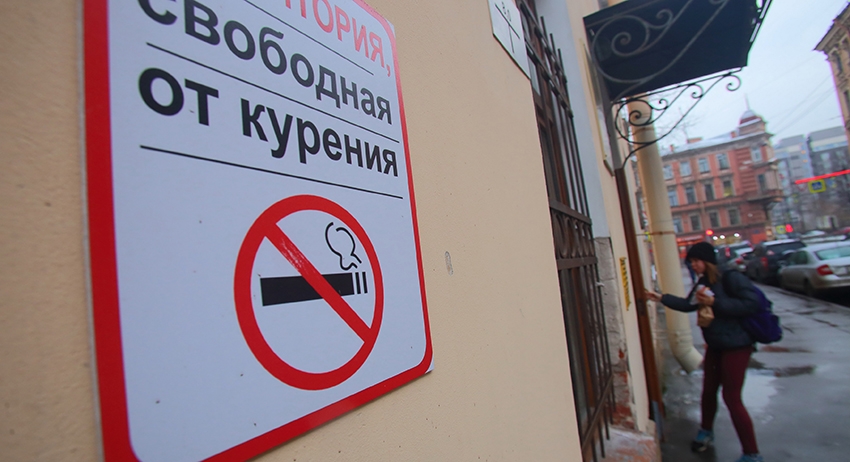 В России запрещено курить на территориях школ, стадионов, вокзалов, а также в поездах и самолетах, в лифтах и на автозаправках.