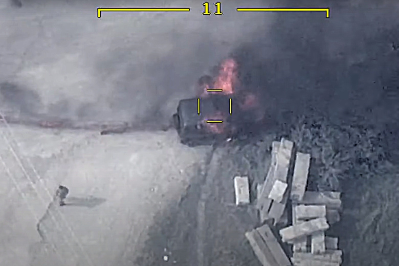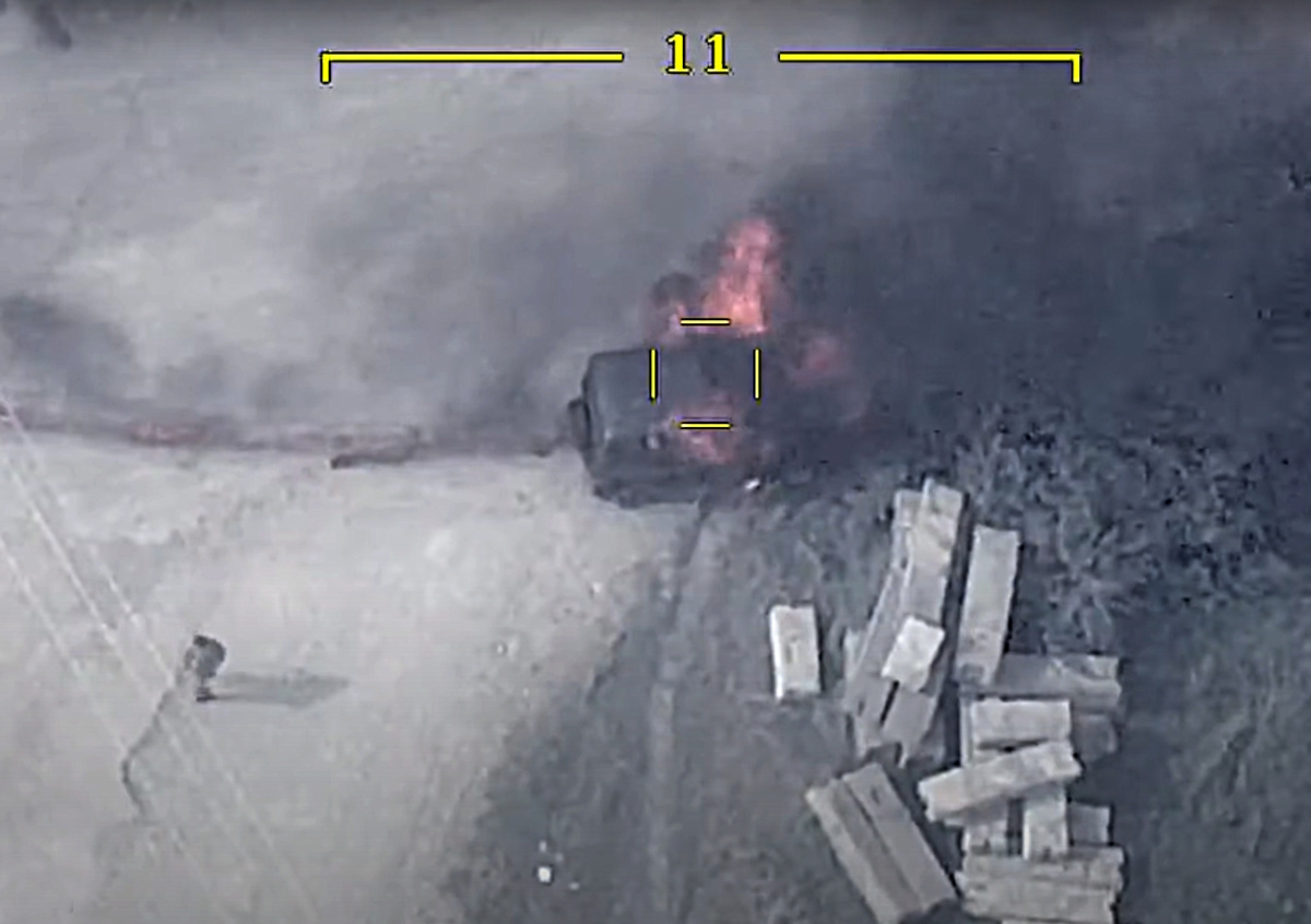 На появившихся в Сети кадрах видно, как служебный автомобиль, в котором, по заявлениям азербайджанской стороны, находился Арутюнян, едет по дороге в сопровождении ещё нескольких машин. По нему наносит удар оперативно-тактический средневысотный беспилотник, сообщают азербайджанские СМИ.