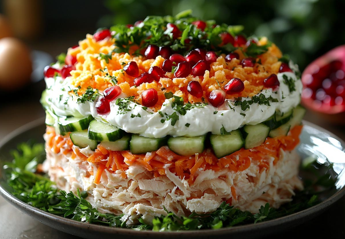Этот салат — настоящее зимнее чудо, которое превратит любой ужин в праздник. Сочетание нежных отварных продуктов, пикантных соленых огурцов и ярких зерен граната создает неповторимую симфонию вкуса. А его нарядный вид, напоминающий искорки на белом снегу, делает его главным украшением новогоднего или рождественского стола. Это блюдо не требует сложных кулинарных навыков, но неизменно вызывает восторг у гостей.