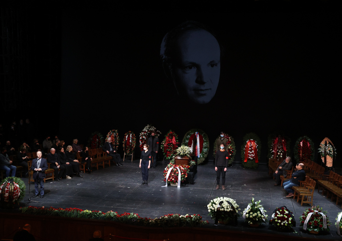 Гроб с телом Мягкова сейчас выставлен на сцене МХТ имени Чехова, в труппе которого он числился с 1977 года. У гроба сидят коллеги артиста по МХТ и «Современнику», выступают друзья.