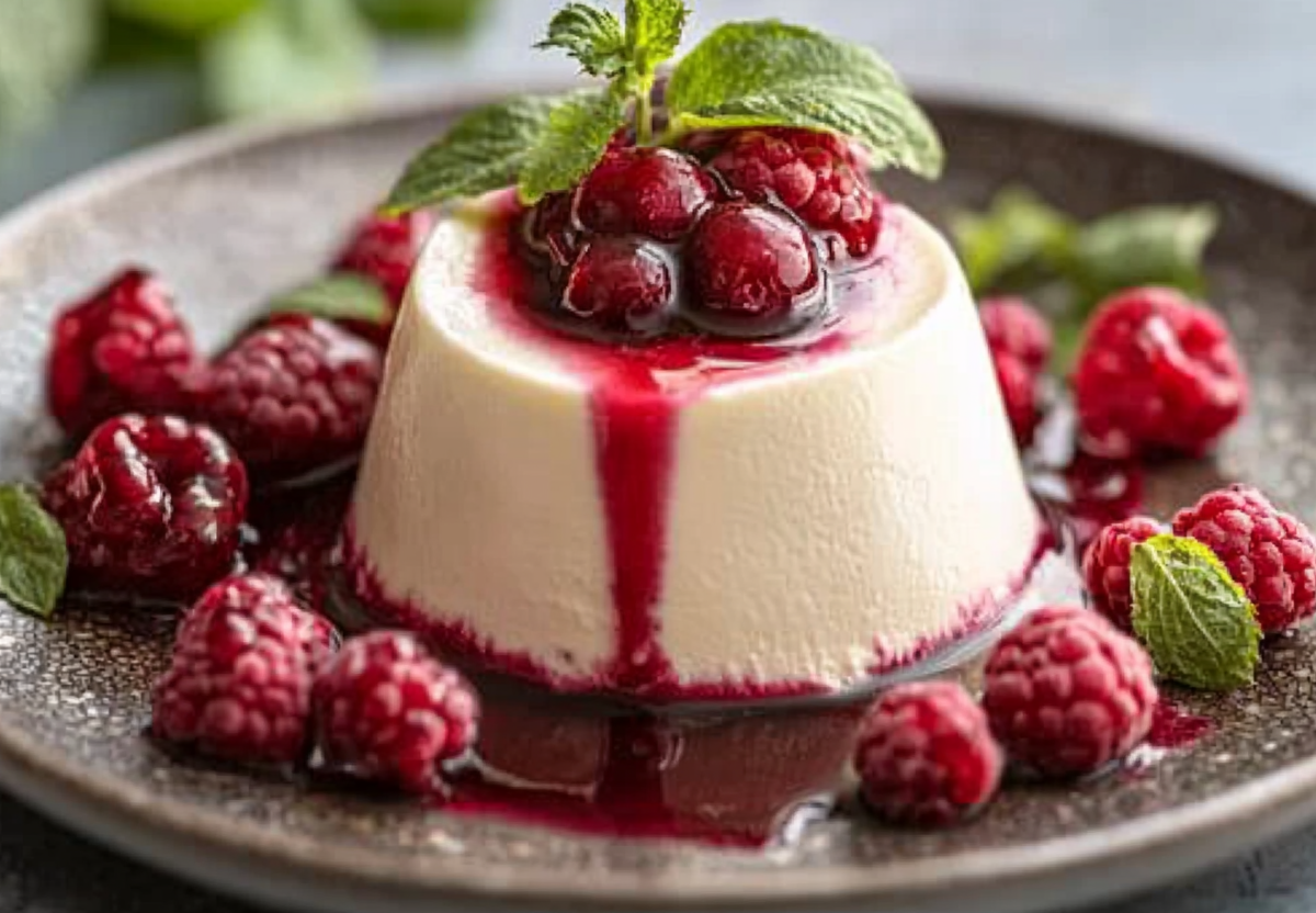 400 мл жирного кокосового молока переливаю в сотейник, добавляю 1,5 ч. л. агар-агара и подсластитель по вкусу, например сироп топинамбура. Тщательно перемешиваю и довожу смесь до кипения на среднем огне, постоянно помешивая венчиком. После закипания продолжаю варить 1–2 минуты, чтобы агар-агар полностью активировался. Затем быстро разливаю смесь по порционным формам и убираю в холодильник для полного застывания минимум на 1–2 часа. Перед подачей слегка провожу ножом по краю формы, переворачиваю десерт на тарелку и украшаю свежим ягодным пюре.