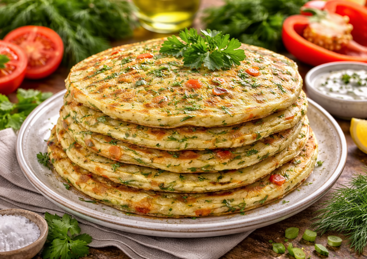 Главный секрет — большое количество свежей зелени. Зелёный лук, укроп и петрушка делают лепёшки по-настоящему весенними и ароматными, а кусочки помидора и сладкого перца добавляют сочность. Растительное молоко в тесте придаёт мягкость и делает вкус более нежным.