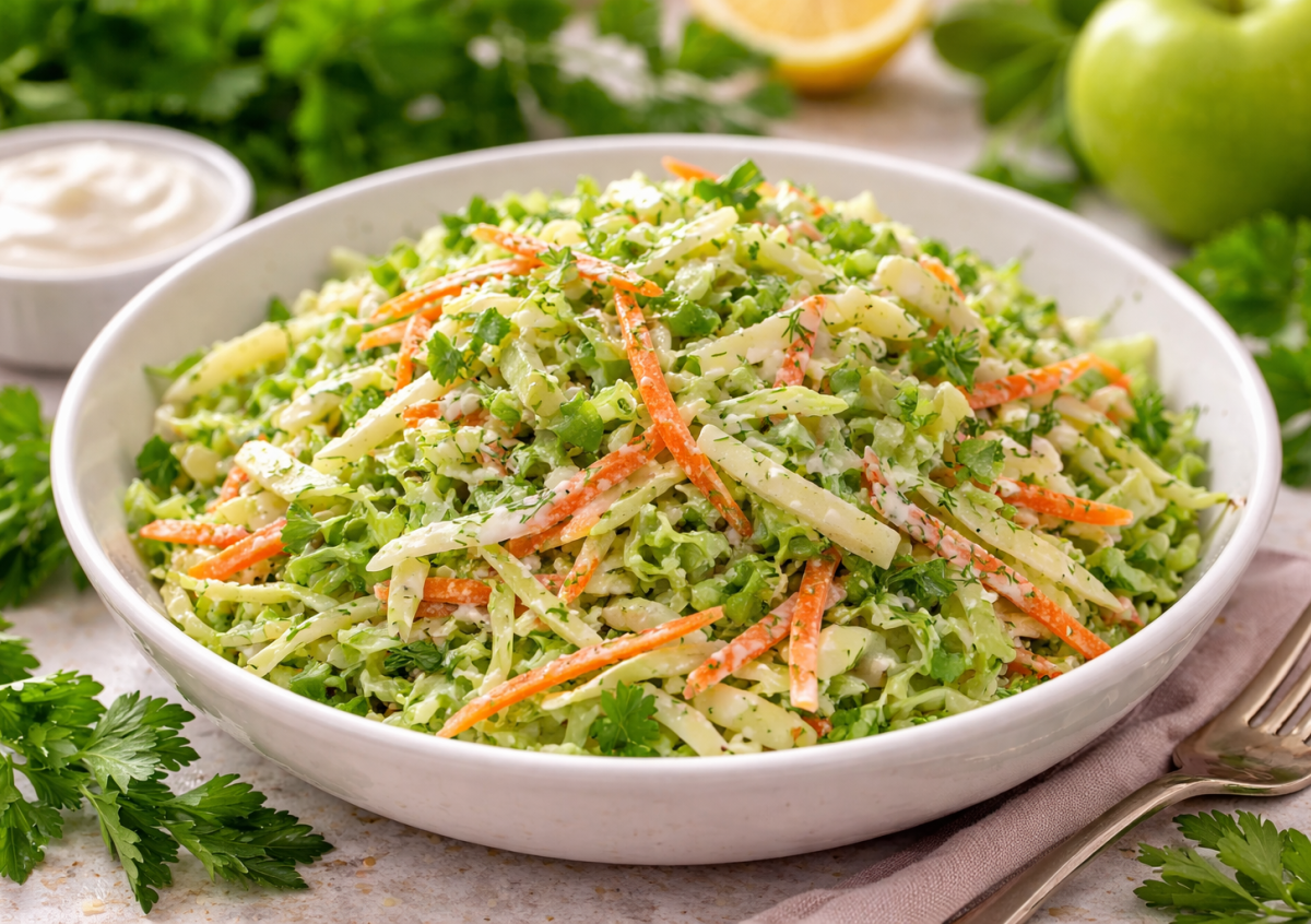 Приготовление: капусту тонко шинкуют и слегка разминают руками, чтобы она стала мягче и дала немного сока. Морковь натирают на крупной терке или режут тонкой соломкой. Стебель сельдерея очищают от жестких волокон и нарезают тонкими полосками. Яблоко очищают от кожуры, удаляют сердцевину и режут тонкой соломкой, после чего сразу сбрызгивают небольшим количеством уксуса или лимонного сока, чтобы оно не потемнело. Укроп, петрушку и зеленый лук мелко нарезают — большое количество зелени делает салат особенно свежим и ароматным. Для заправки в небольшой миске смешивают натуральный йогурт, горчицу, яблочный уксус и мед, добавляют щепотку соли и немного черного перца. Соус должен получиться нежным, слегка пикантным и с легкой кисло-сладкой ноткой.