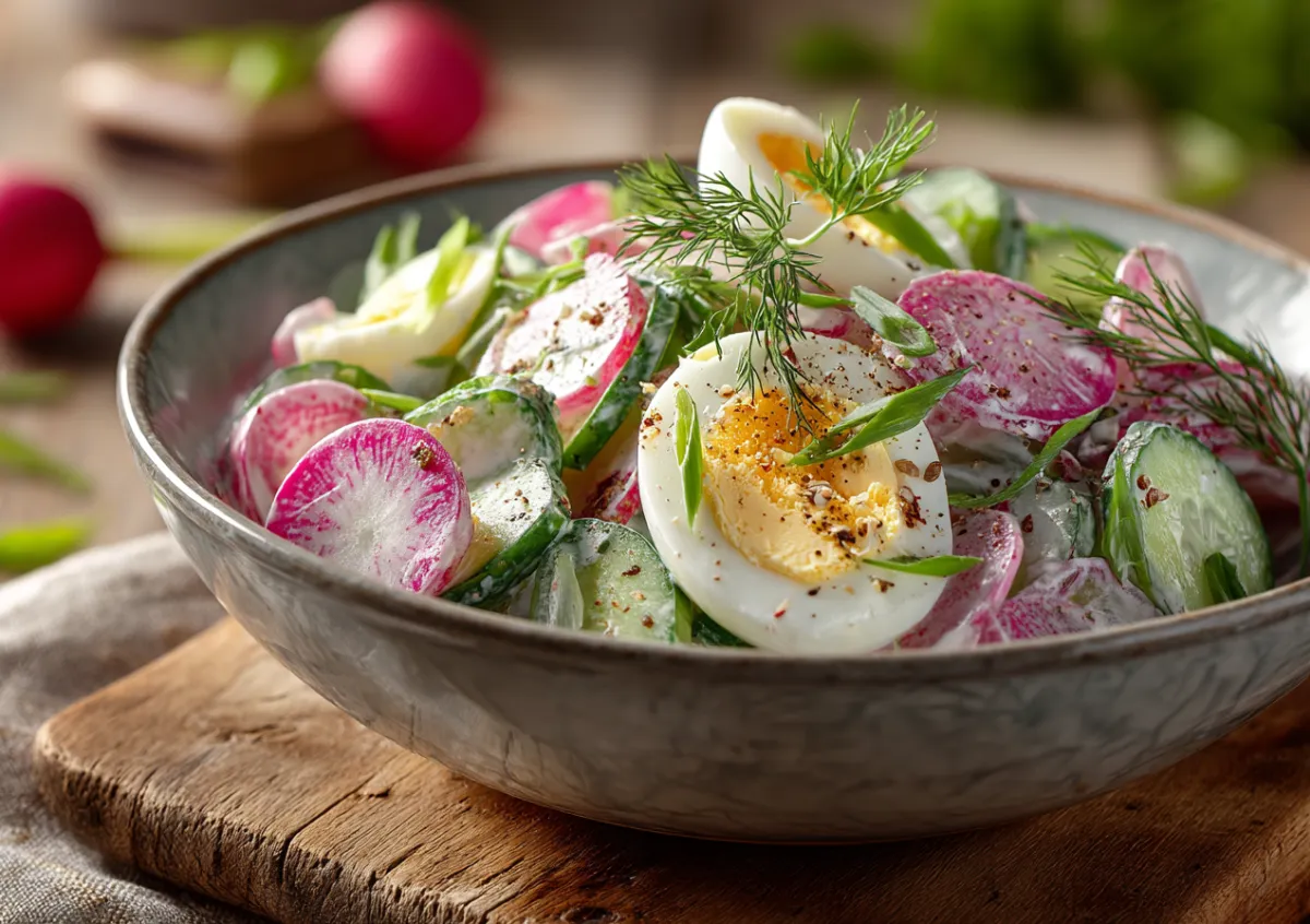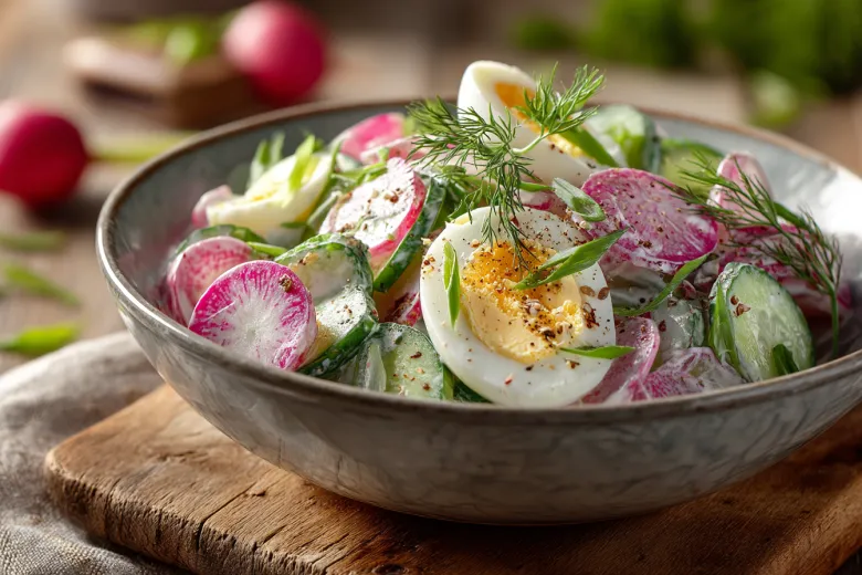 Подавайте сразу: салат получается свежим, ароматным и очень аппетитным, будто сама весна на тарелке.