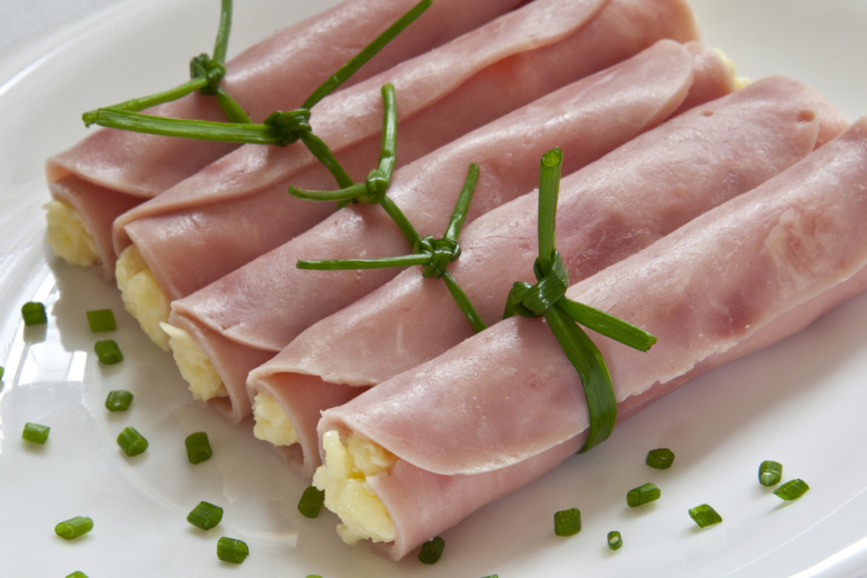 Вам понадобится: 10 тонких ломтиков хорошей ветчины, 200 г твердого сыра, 3 вареных яйца, пучок свежего укропа, 3 столовые ложки майонеза или сметаны, зубчик чеснока (по желанию). Сыр натрите на мелкой терке. Яйца и укроп мелко порубите. В глубокой миске соедините сыр, яйца и зелень. Добавьте майонез и чеснок, пропущенный через пресс, тщательно перемешайте до однородной пластичной массы. На край каждого ломтика ветчины выложите 1–1,5 ст. ложки начинки. Аккуратно, но плотно сверните рулетики. Выложите их на блюдо швом вниз. Для лучшего вкуса дайте рулетикам пропитаться в холодильнике 30–40 минут. Перед подачей для красоты можно нарезать каждый рулетик пополам наискосок.